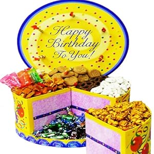 This extra special gift box is shaped like a real birthday cake complete with decorative candles! It's filled with sweets and surprises for your lucky gift recipient to celebrate their special day. Lift the lid off the box to reveal 4 separate "slices" of cake, each "slice" holds a different treat to enjoy including gourmet Butter Toffee Popcorn, Frosted Pretzels, delicious Chocolate Chip Cookies, gourmet savory Snack Mix, Fruit Gel Candy, and an assortment of Toffees in Chocolate, Butter Rum, Vanilla and Coconut. Each gift beautifully detailed and includes a personalized gift card message from you. An original gift basket arrangement designed just for you by Art of Appreciation Gift Baskets.